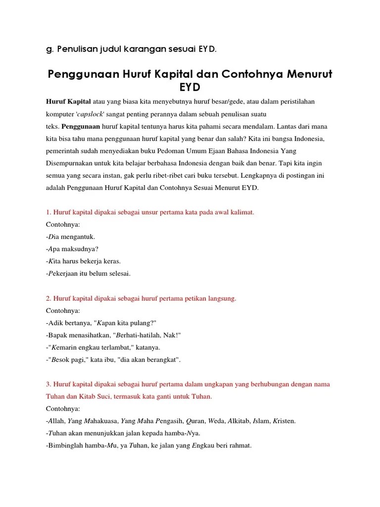 Maksudnya disini adalah penulisan judul tidak perlu menggunakan tanda baca. penulisan daftar pustaka terdiri dari beberapa jenis sesuai dengan sumber rujukan yang digunakan. penulisan huruf kapital yang sesuai dengan puebi by mtoha pop 0 comments pada tahun 2015, menteri pendidikan dan kebudayaan republik indonesia mengubah pedoman umum ejaan yang disempurnakan (eyd) menjadi pedoman umum ejaan bahasa indonesia (ebi). Dalam penulisan ilmiah ataupun dalam penerjemahan teks formal, pengetahuan akan ejaan yang disempurnakan dan penulisan yang benar sesuai dengan eyd sangat diperlukan. eyd yang digunakan saat ini adalah eyd yang telah disepakati oleh 3 negara yakni indonesia, malaysia dan bruneidarussalam.